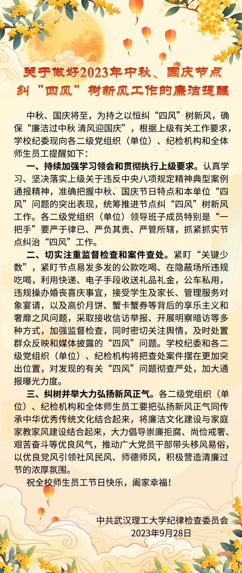 关于做好2023年中秋、国庆节点 纠“四风”树新风工作的廉洁提醒