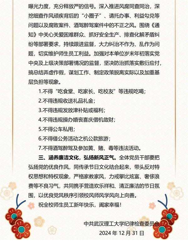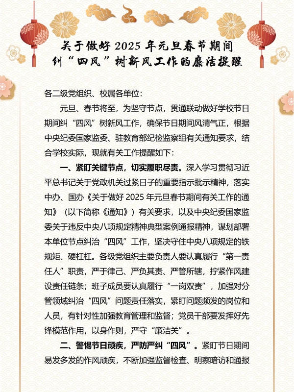关于做好2025年元旦春节期间 纠“四风”树新风工作的廉洁提醒