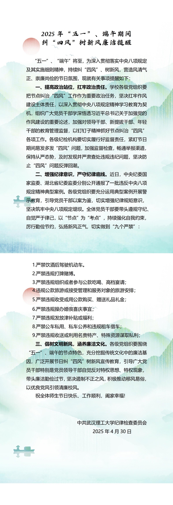 2025年“五一”、端午期间 纠“四风”树新风廉洁提醒