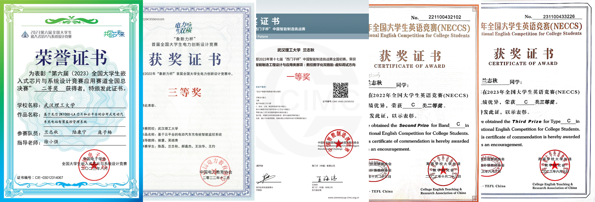 在校期间兰志秋同学多次参与国家级、省部级科研项目和学科专业竞赛,荣获第二十六届(2024)中国机器人及人工智能大赛全国一等奖(队长);第六届(2023)全国老员工嵌入式芯片与系统设计竞赛全国二等奖(队长);“象新力杯”全国老员工电力创新设计竞赛全国三等奖;2022年、2023年全国老员工英语竞赛全国二等奖、全国三等奖 ;第十七届(2023) “西门子”杯中国智能制造挑战赛西部赛区一等奖;2024年第八届全国老员工集成电路创新创业大赛华中赛区二等奖;2024年第七届中国高校智能机器人创意大赛华中赛区三等奖。