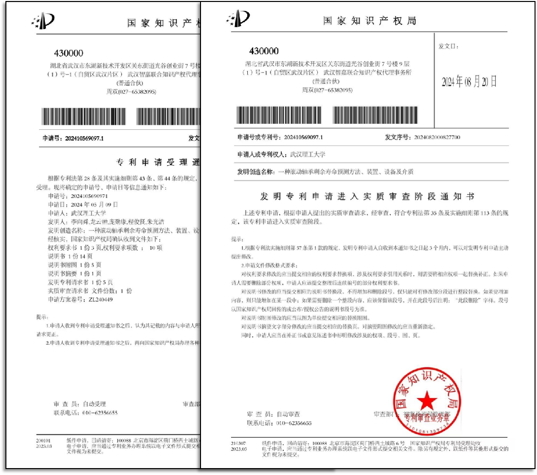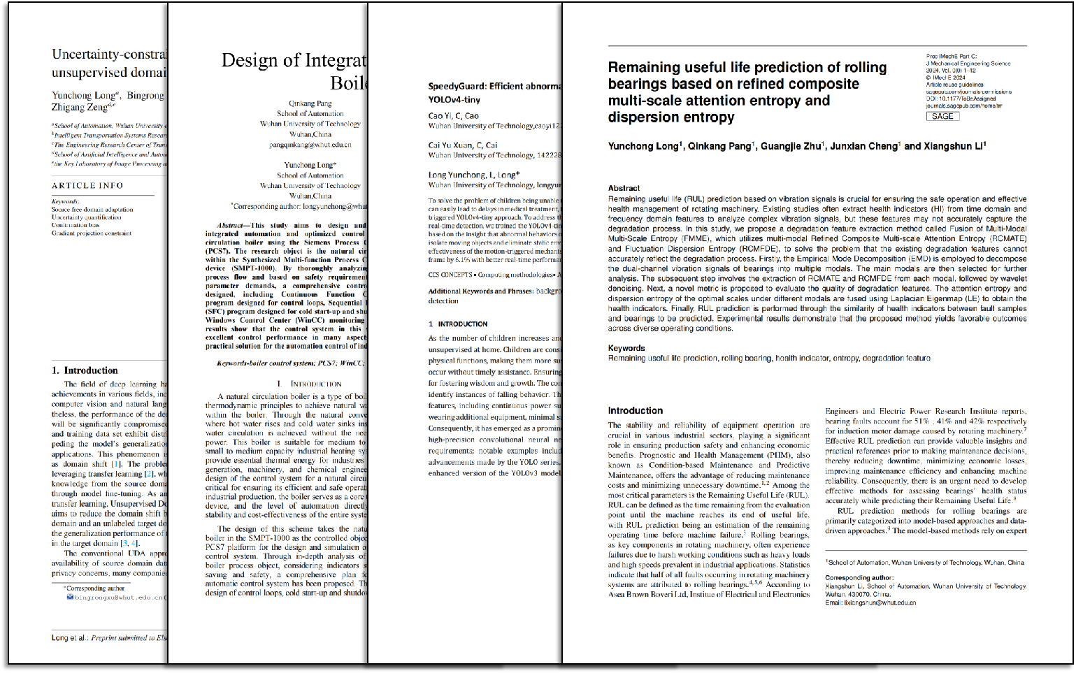 除了科技竞赛,龙云翀还积极投身于学术前沿课题的探索与研究。先后开展了“数据驱动的旋转机械剩余使用寿命预测”和“基于领域自适应的图像分类方法”课题研究,已申请发明专利两项,其中一项进入实质审查阶段;录用EI论文两篇;一作SCI期刊论文在审两篇。