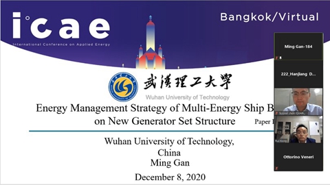 在十二届国际应用能源大会上,甘铭同学在分会场做口头报告,分享了题为“Energy Management Strategy of Multi-Energy Ship Based on New Generator Set Structure”的主题演讲。在演讲中对混合动力船舶能量管理策略研究进行分享。会议期间超过100人次在线聆听了本主旨报告,有效促进了业界和学术界之间的见解和创新交流。