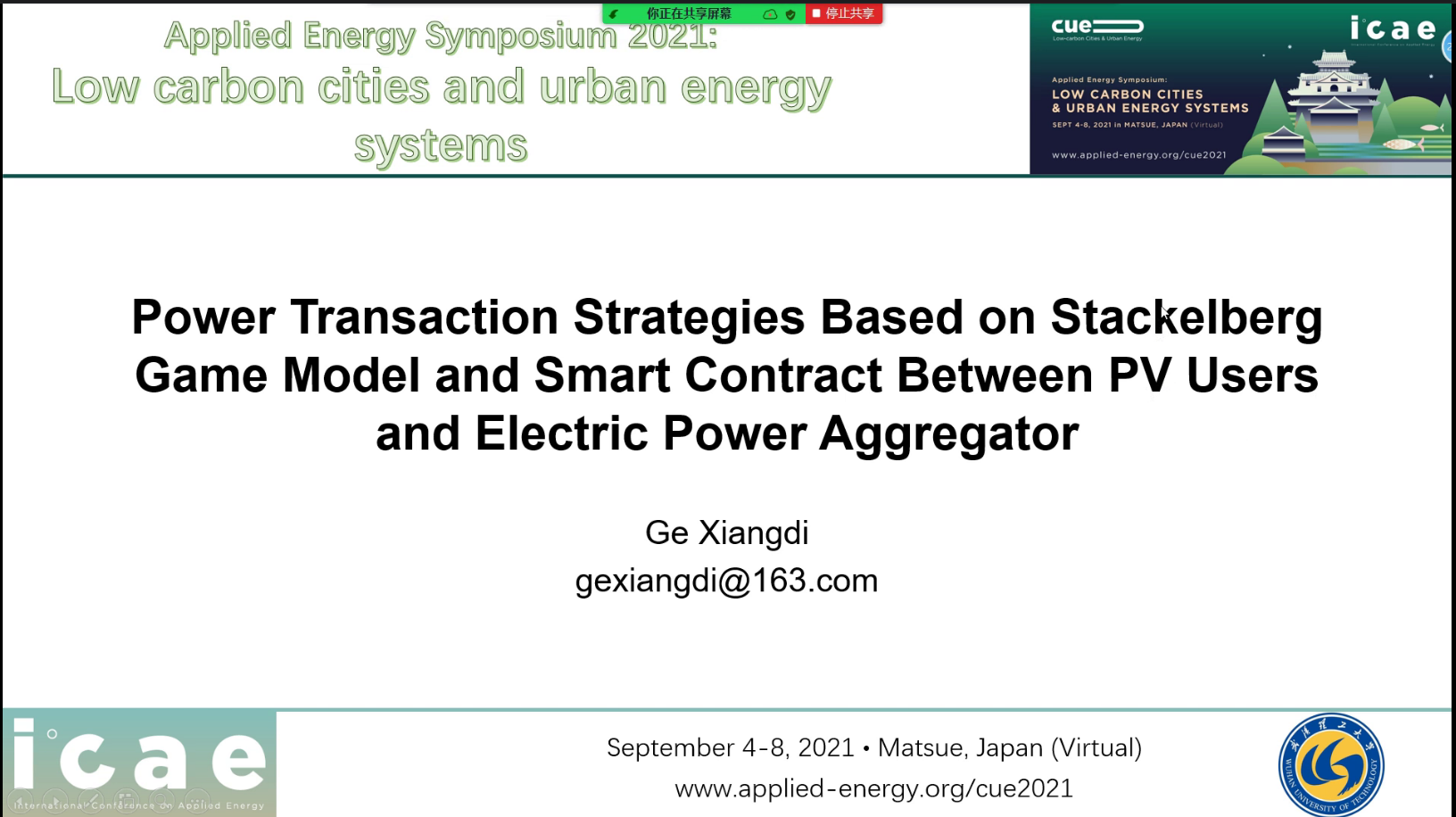 2021年9月4号至8号,第7届应用能源:低碳城市及城市能源系统国际研讨会(CUE2021-The 7th Applied Energy Symposium 2021: Low carbon cities and urban energy systems)在日本松江举办。来自欧洲、亚洲等多所知名高校及研究机构的上百名国内外专家、学者参加了这几场能源与电气工程领域盛会。由于受全球疫情影响,会议均在线上进行。公司研究生王逸凡同学参加了本次会议。
