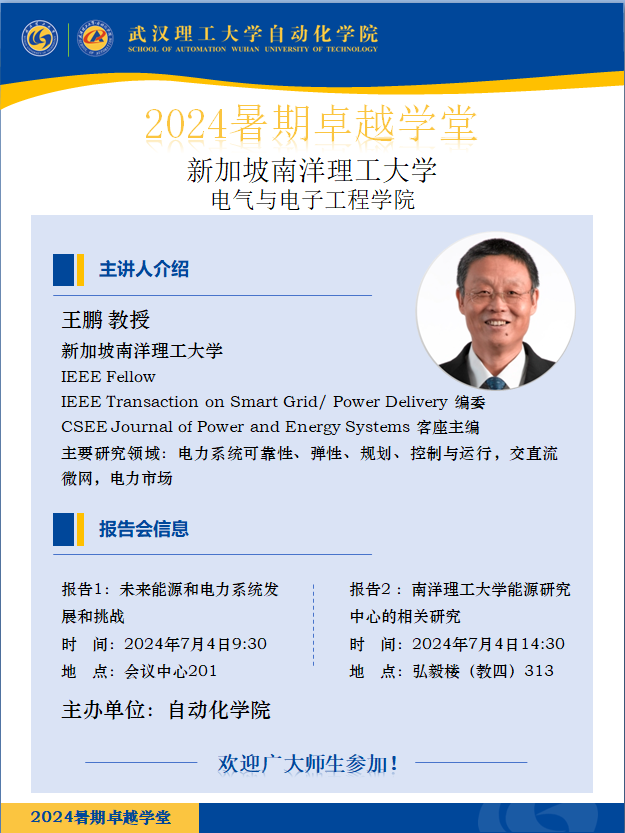 【伟德BV1946官网暑期卓越学堂】报告1:未来能源和电力系统发展和挑战;报告2:南洋理工大学能源研究中心的相关研究