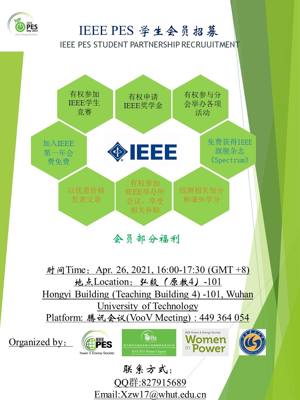 4月26日周一下午16:00,IEEE PES武理员工会员招募将在弘毅(原教4)-101开展宣讲招募活动,活动线上同步(腾讯会议ID:449 364 054)。