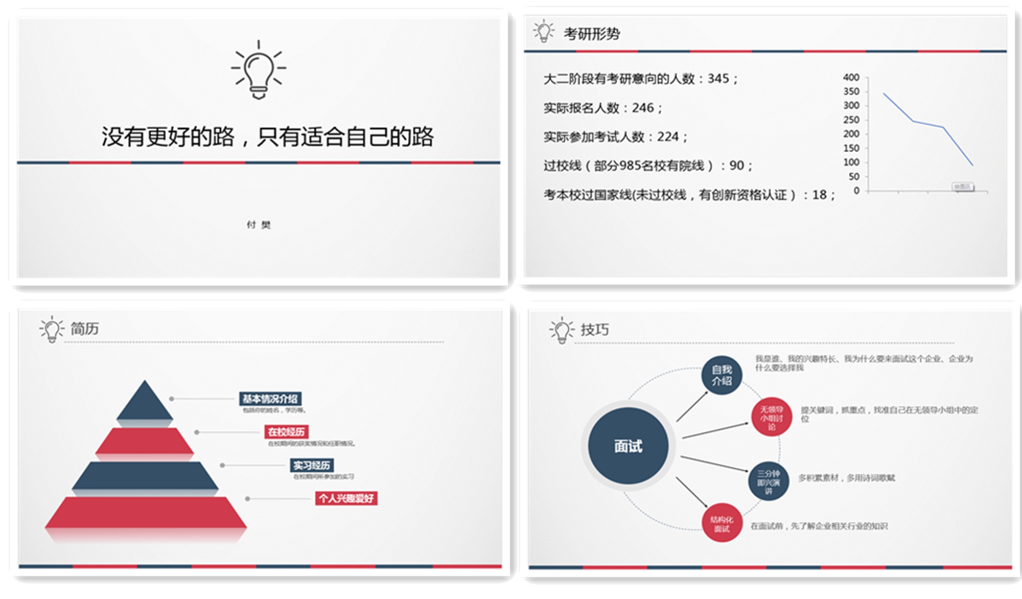 2016级员工付樊以“没有更好的路,只有适合自己的路”为主题进行分享,他从“本科生求职没竞争力”这一误区着手,结合2016级考研的相关数据,指出同学们应根据个人实际情况,做好自我生涯规划,在就业和读研的选择上不盲从。随后,他结合自己求职经历,给同学们提出了明确目标、调整心态等建议,介绍了求职过程中准备环节、简历书写、目标调整、应聘技巧所要注意的要点和细节。